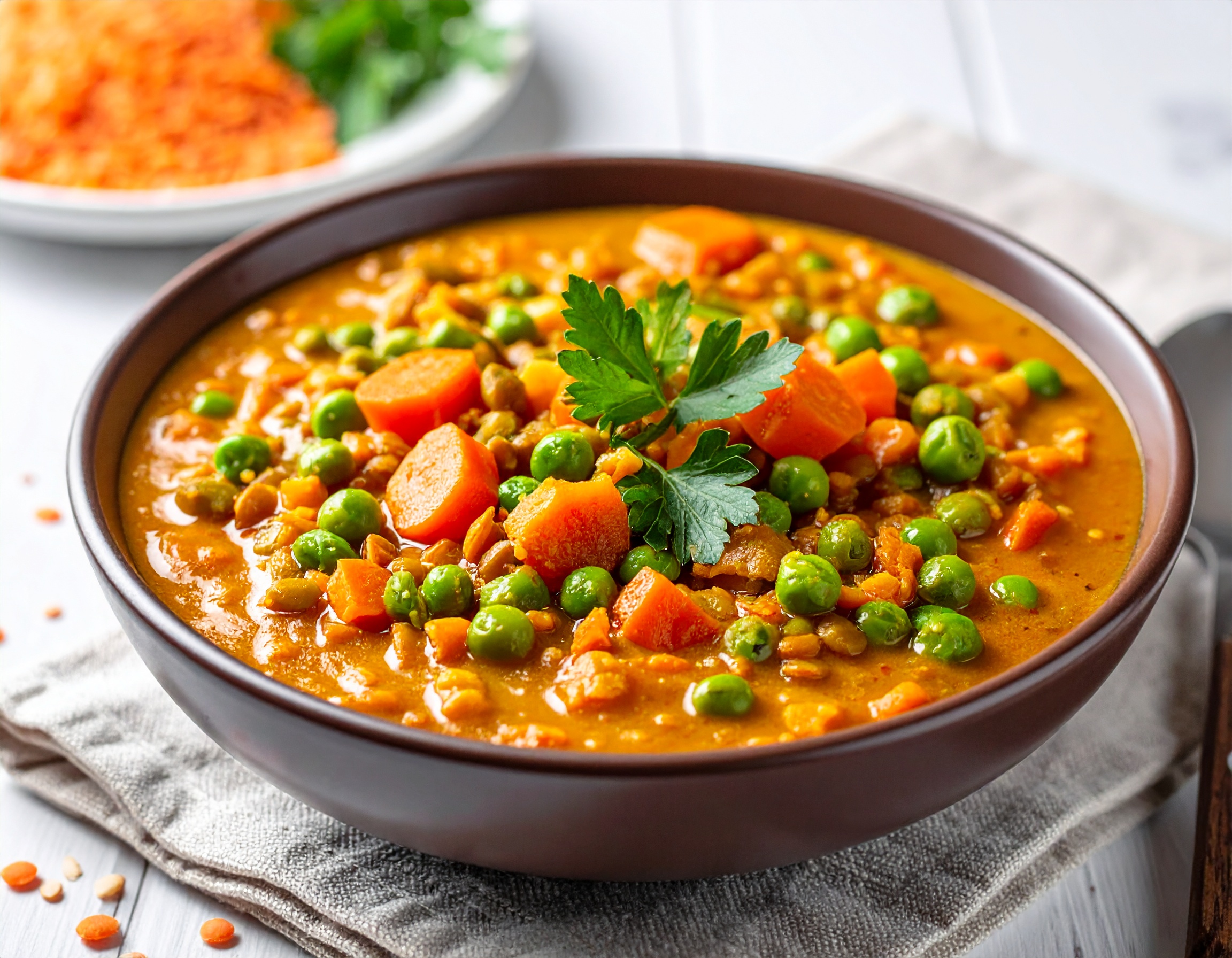 Red lentils simmered with onion, garlic, ginger, curry powder, turmeric, carrots, and bell pepper in coconut milk, brightened with cilantro and lime.