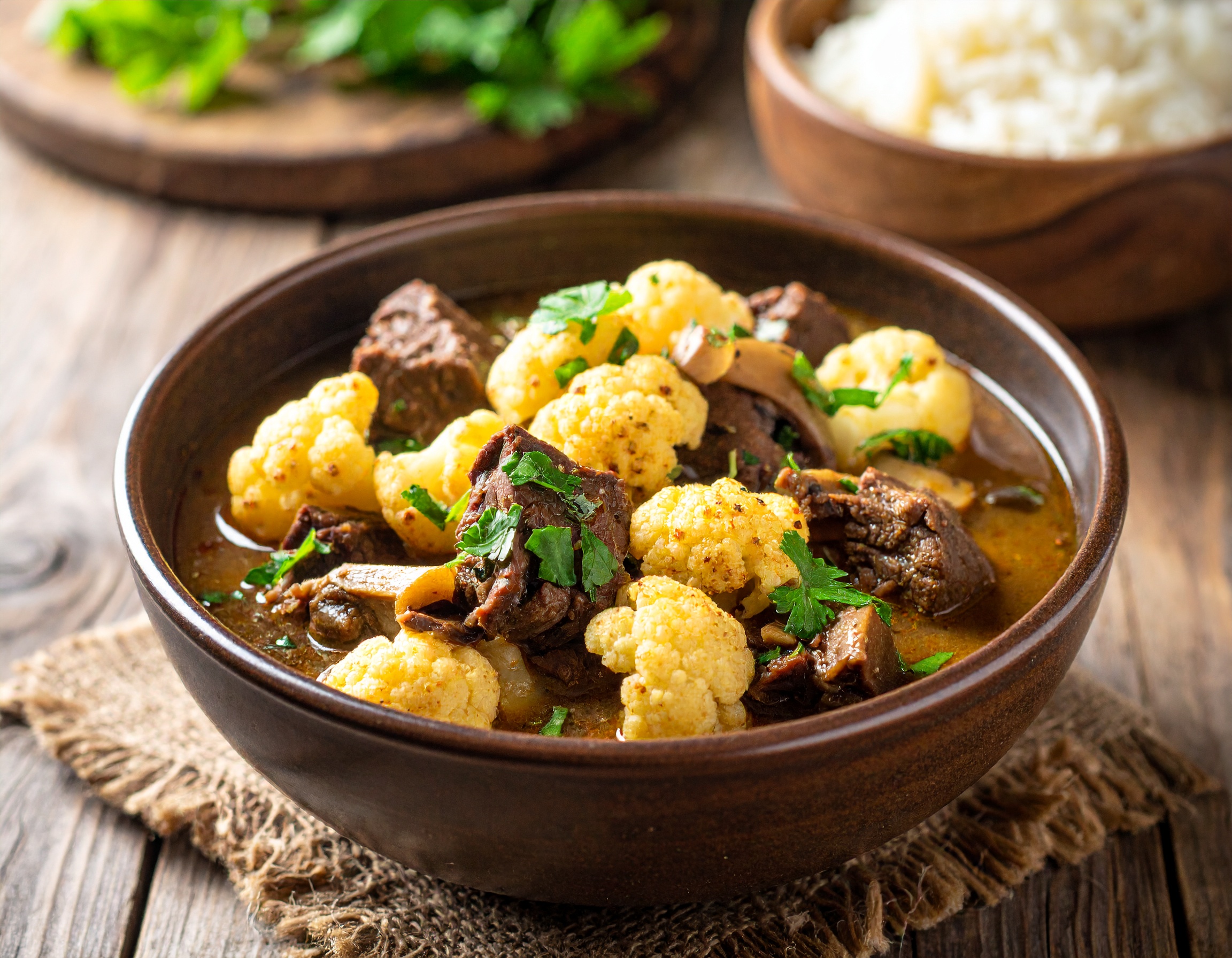 Beef stew meat simmers low in beef broth with cauliflower, onion, garlic, and paprika until tender—keto and naturally gluten‑free.