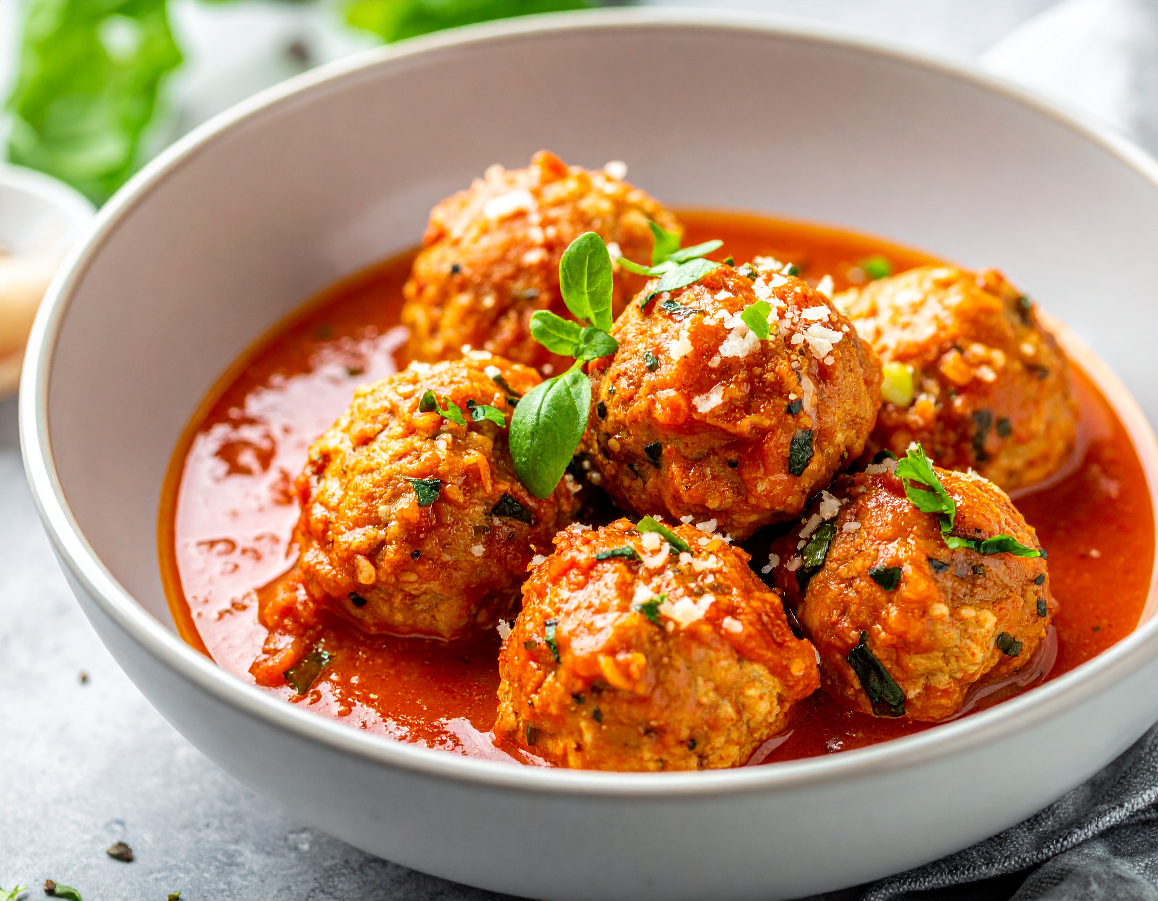 Turkey meatballs (with egg, breadcrumbs, onion, garlic, and oregano) simmer low in marinara until tender—serve over pasta or vegetables.