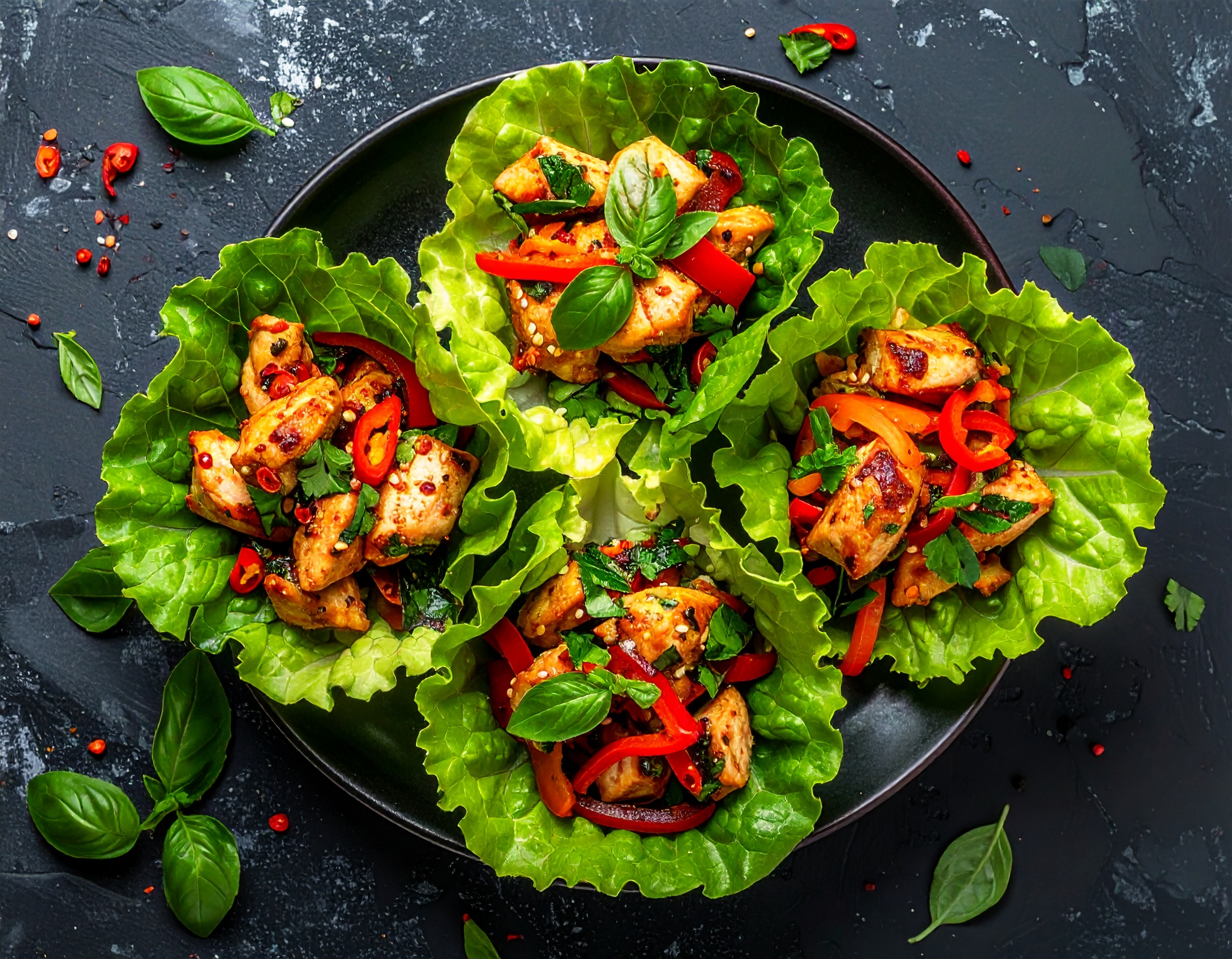 Fragrant Thai basil stir-fried chicken served in crisp lettuce leaves, with fresh herbs and a touch of chili heat — a light yet bold dish that feels…