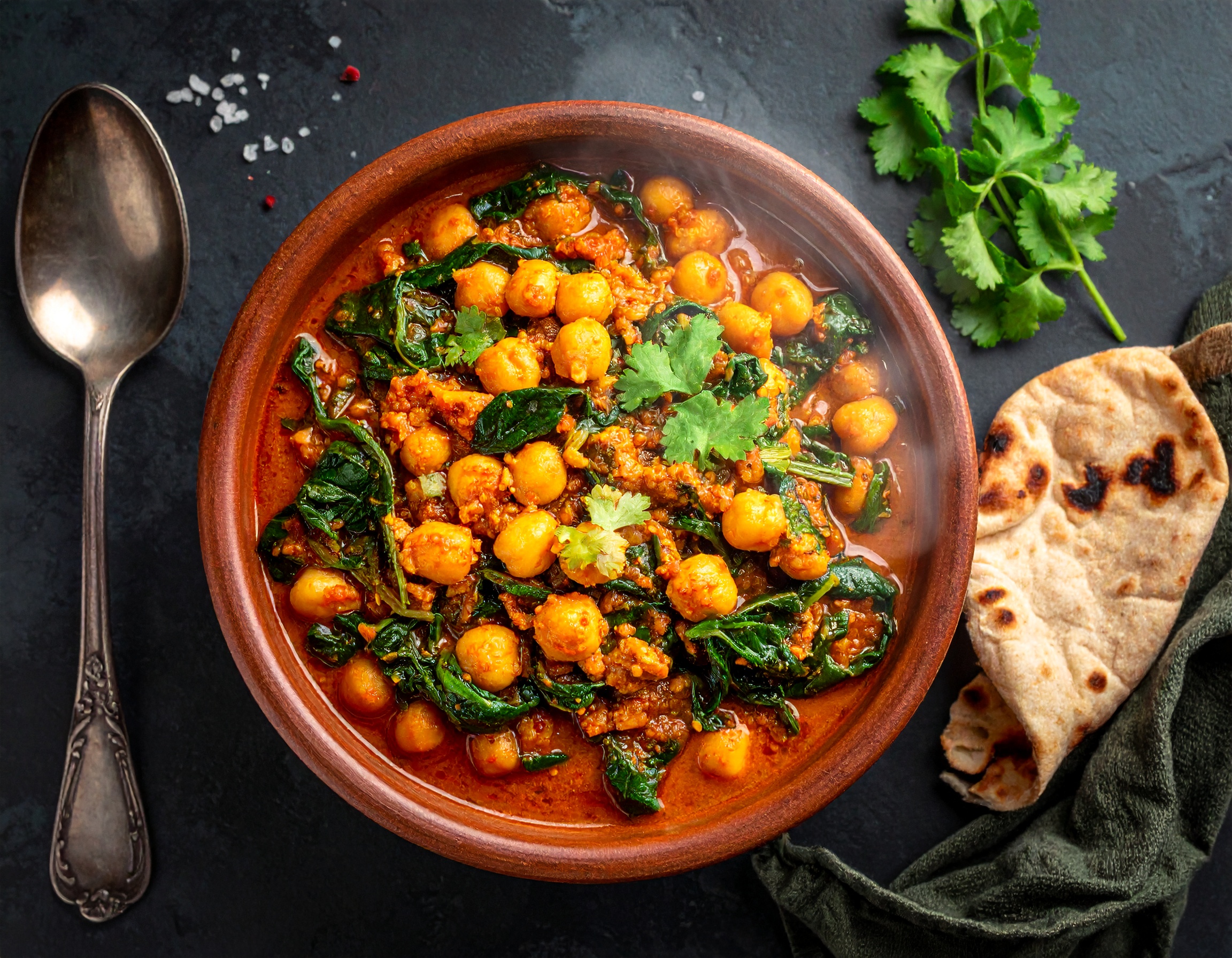 A cozy tomato-chickpea curry simmered with garam masala and fresh spinach - plant-powered comfort with pantry staples.
