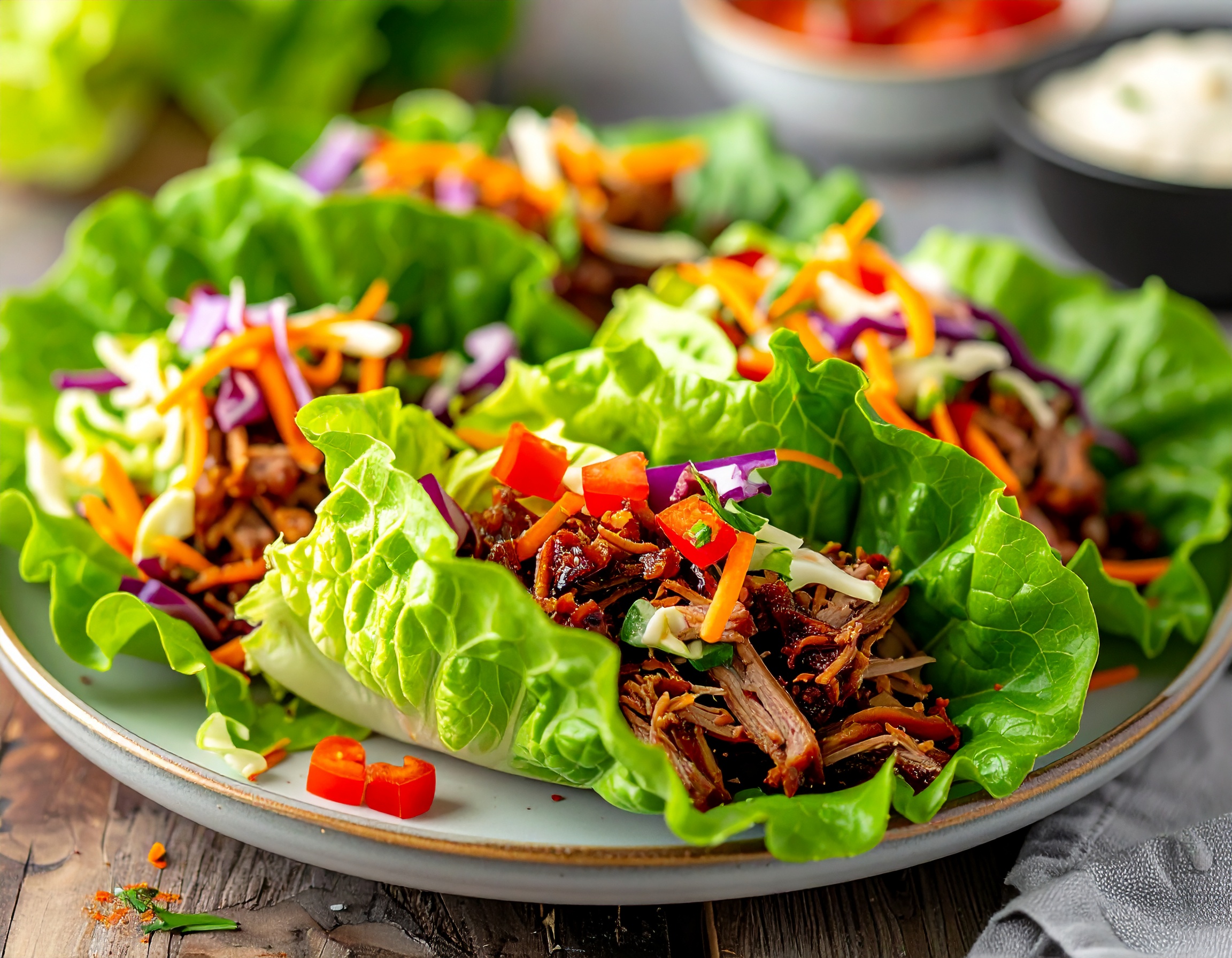 Juicy pulled pork warmed with sugar‑free BBQ sauce, spooned into crisp lettuce leaves and topped with quick apple‑cider‑vinegar slaw—smoky,…